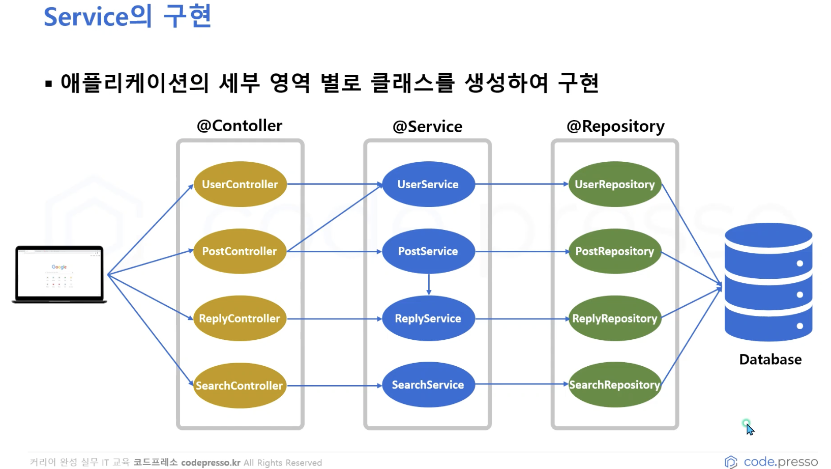 이 때 Service 계층은 View & Database의 종류와 상관없이 독립적인 계층으로 , 두 설정으로 인해 영향이 생기지 않도록 설계해야 한다.