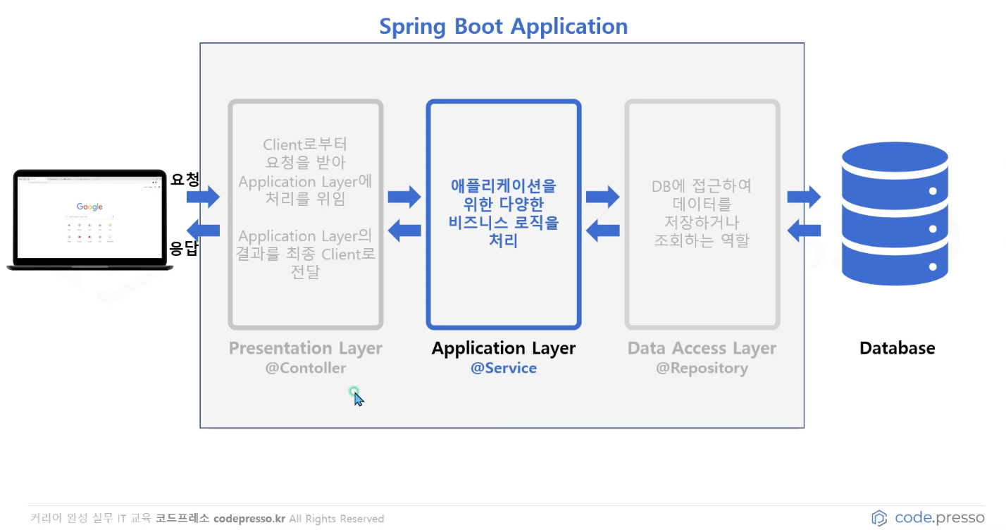 2. 애플리케이션 계층 [@Service] : 애플리케이션을 위한 다양한 비지니스 로직들이 위치하고, 데이터가 처리된다.