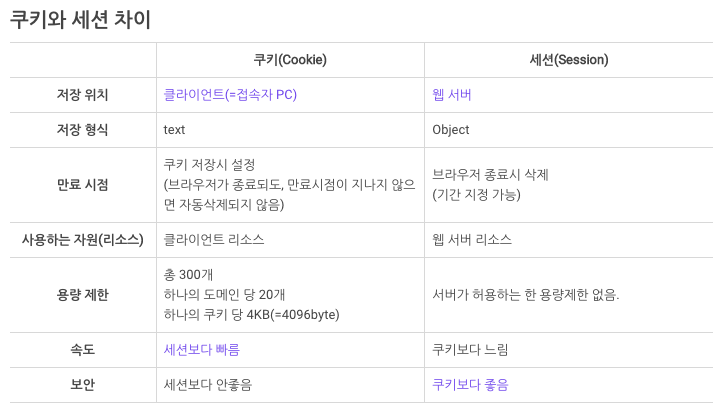 이 때 가장 큰 차이는 사용자의 정보가 저장되는 위치인데, 쿠키의 경우에는 클라이언트에 정보를 저장하고 세션은 서버에 정보를 저장한다