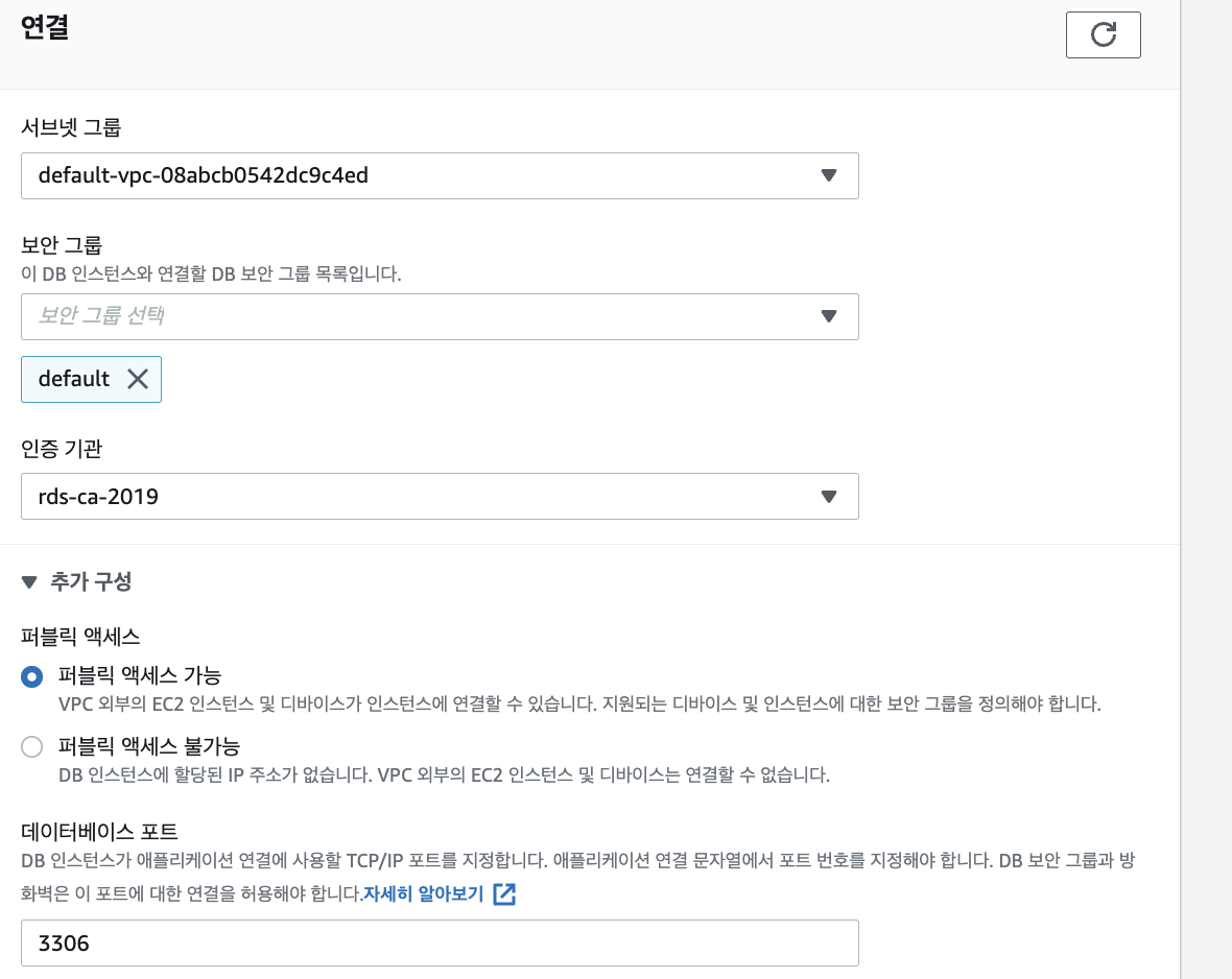중요한 점은 보안 그룹을 설정한 뒤 연결을 위해서 퍼블릭 엑세스 가능을 열어두어야 합니다.