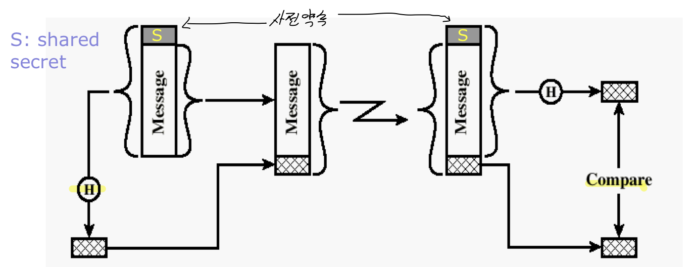 - 일반 암호화를 이용한 메시지 인증 : 발신자와 수신자만 키를 공유해야 한다.