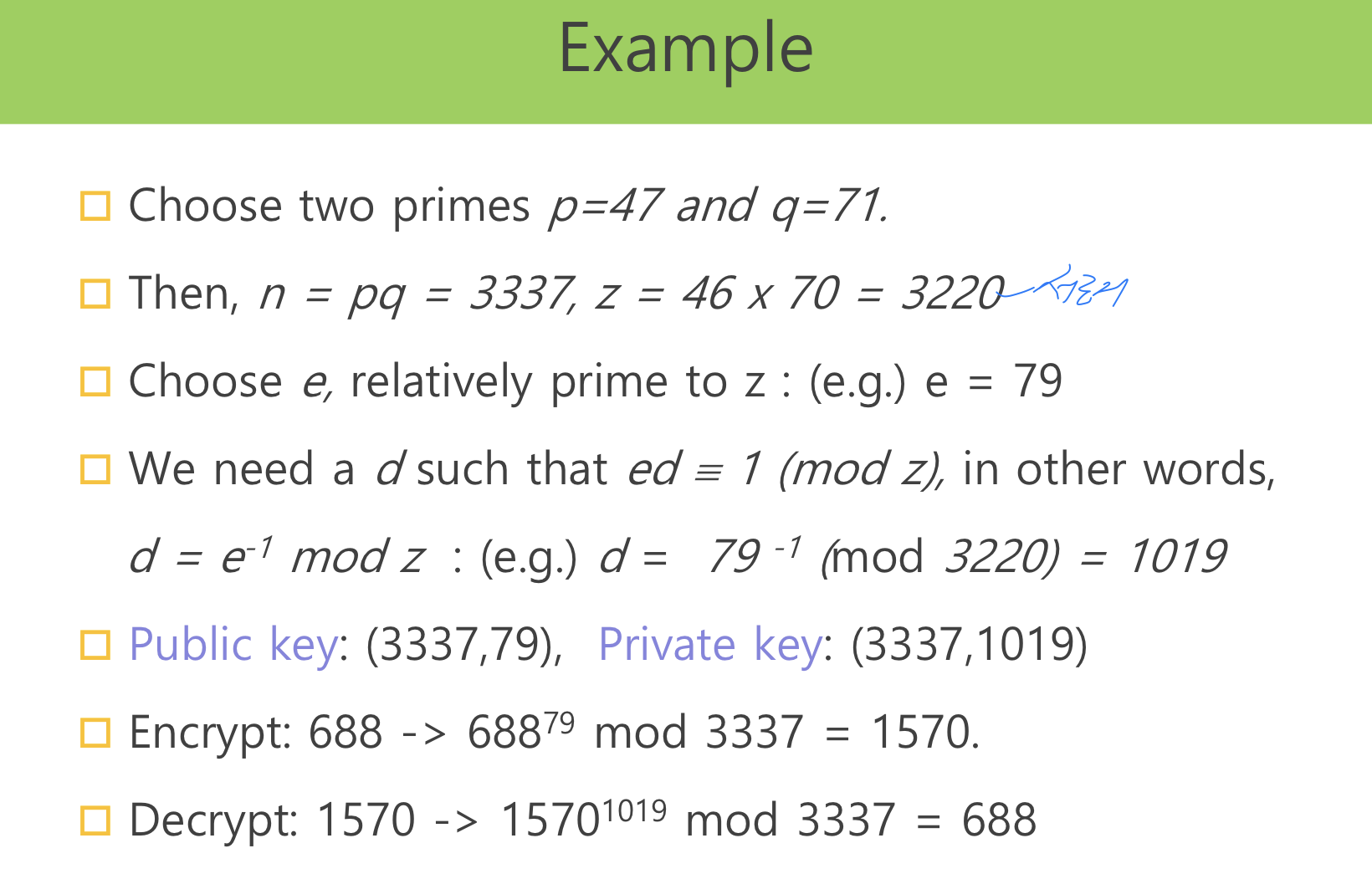 - 가장 큰 수의 소수 p, q를 사용한다 ( N = p*q , Z=(p-1)(q-1) )