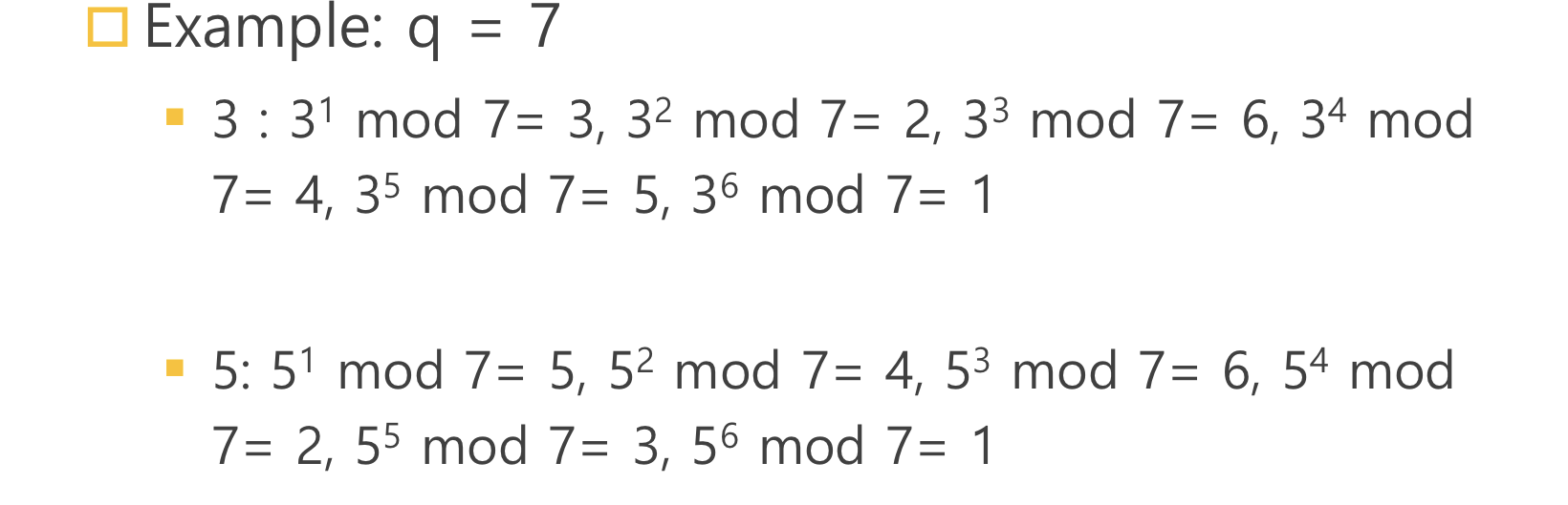 - a : a < q and q의 primitive root ( 원시근 )