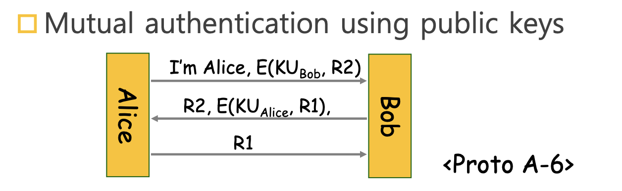 송신자가 자신을 먼저 증명해야 한다. 비효율적: 인증을 위한 메시지 교환이 최소 5번 수행된다. |
