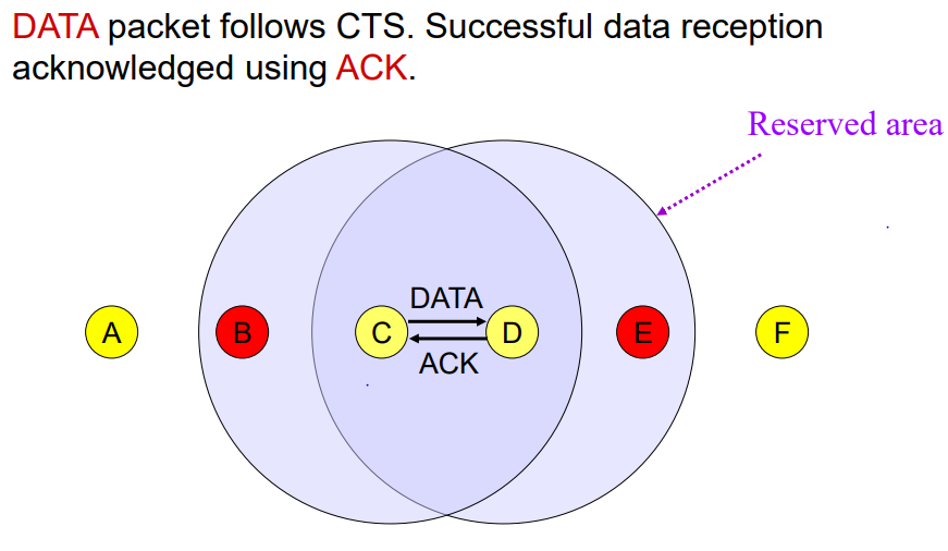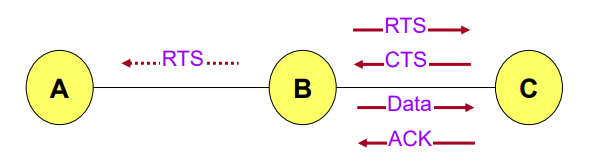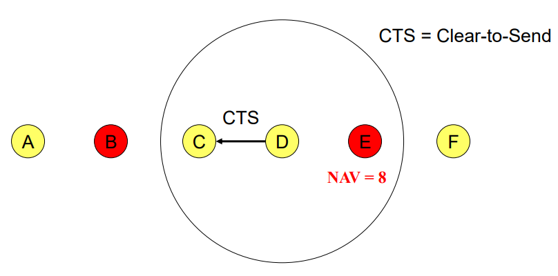 - CTS를 엿듣는 노드가 전송 기간 동안 전송에 참여하지 않는다.