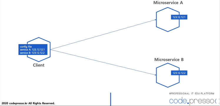 - 전통적 환경 서버들은 위치 정보가 정적인 경우가 많아서 원격 서버의 위치 정보를 설정 파일 등으로 관리가 가능했음