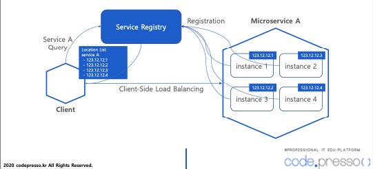 - Client가 원격 자원의 주소 정보를 조회하고 유지함 , Service Registry로 부터 서비스들의 주소 정보를 조회함