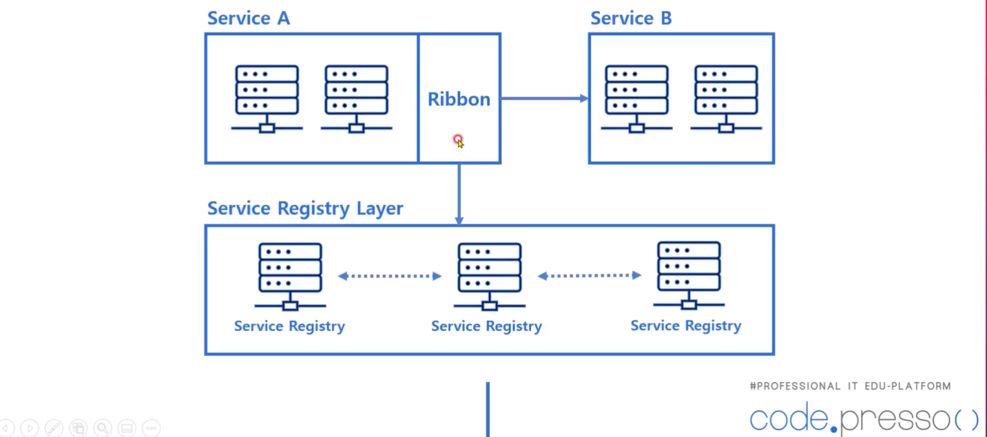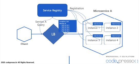 - client는 Load Balancer를 통해 원격 서비스를 호출함 ( LB는 인스턴스 목록을 service registry로 부터 조회함 )
