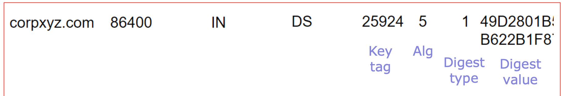 ![]() Key tag : DNSKEY RR의 키 태그 값 ( DNSKEY RR 은 DS RR을 가리킴 ) Alg : DNSKEY RR의 알고리즘 Digest type : 암호분을 만드는 알고리즘 (SHA-1 , SHA-256 .. ) Digest : DNSKEY RR digest value |