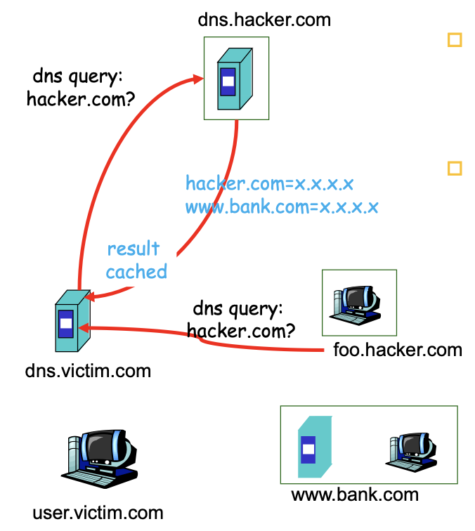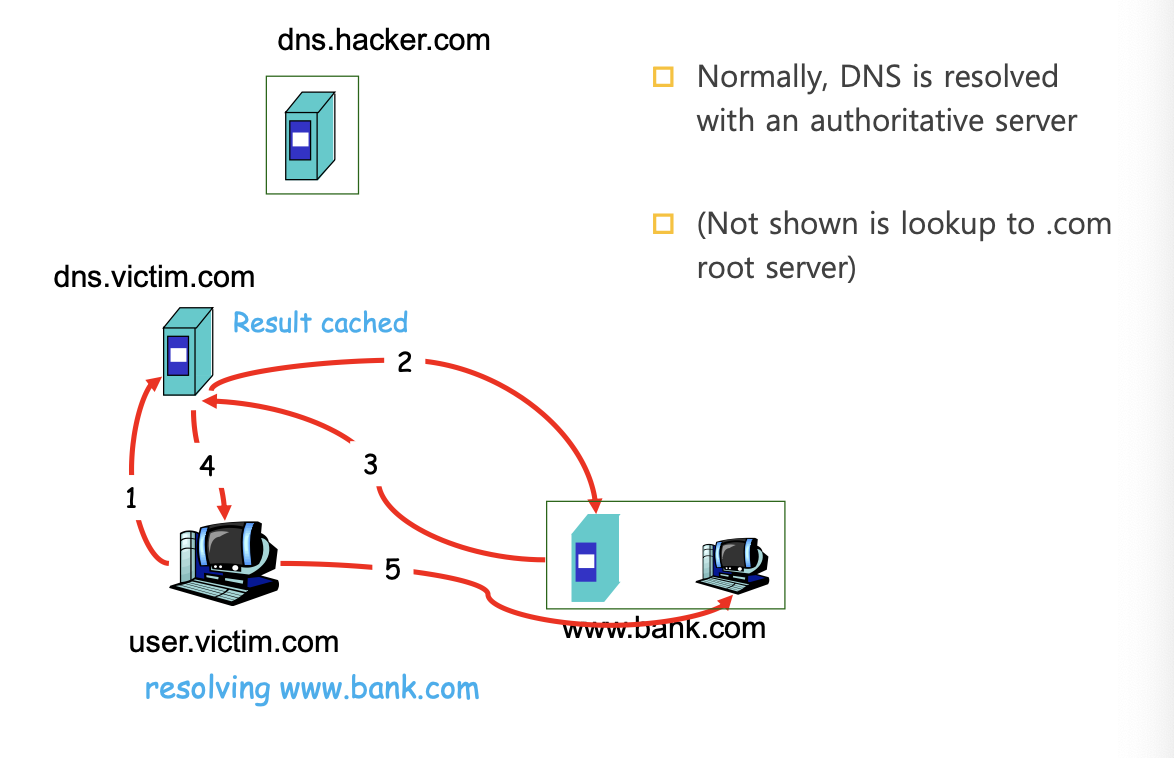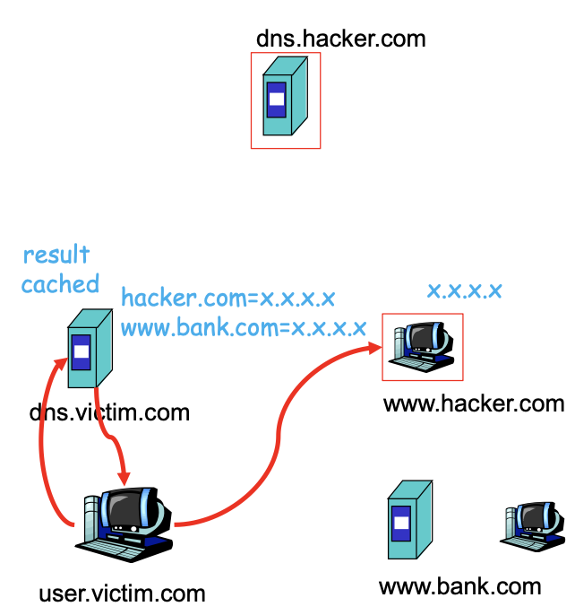 > victim.com의 사용자가 은행을 찾으면 해커의 사이트로 리디렉션 > 해커는 비밀번호 등을 얻기 위해 가상의 모방 사이트를 만듬. > 추가 정보를 무시하도록 BIND가 패치되되어서 더 이상 작동되지는 않음 ( 현재는 보안 문제로 패치 ) |