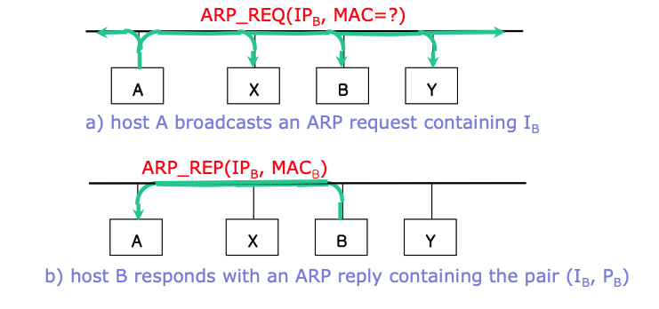 (A) : host A는 ARP 요총울 IPb에 해당하는 브로드 캐스트 전체 노드에게 request 요청함