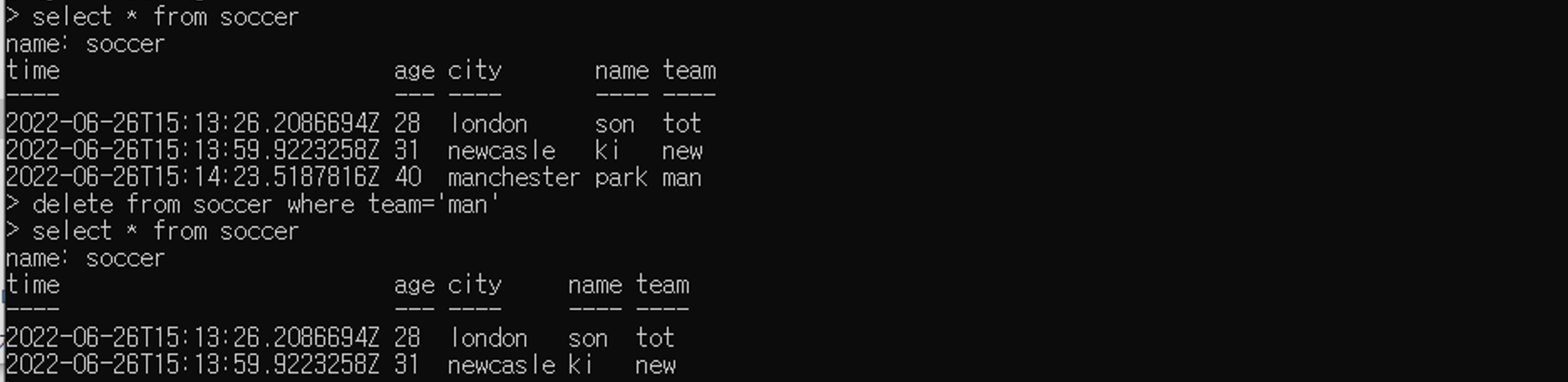 Soccer , name = son, team=tot city="london",age=28 1503050103502 Soccer , name = ki, team=new city ="newcastle", age=31 1503040234000 Soccer , name = park, team=man city="manchester", age=40 150324100000 |