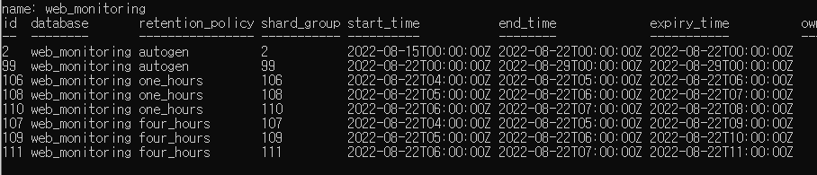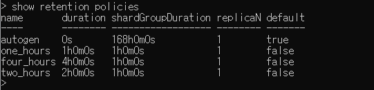 각 1시간, 4시간, 2시간 주기로 관리되는 Retention policy를 생성함