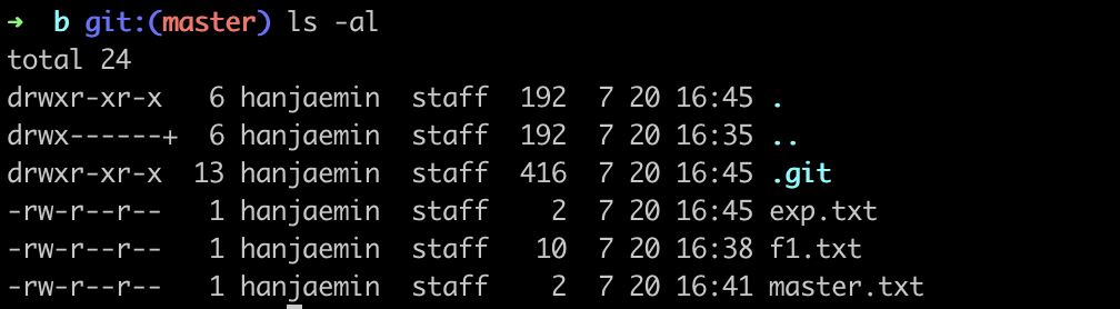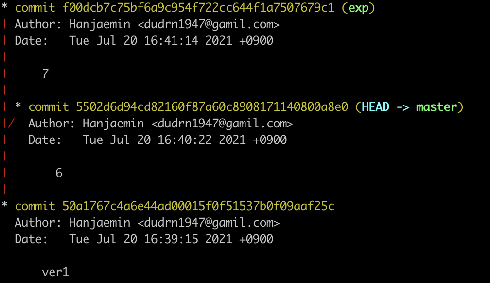 각각의 master와 exp branch에는 자신의 이름을 가진 txt파일을 저장한 뒤에 commit하였습니다. 이제 이 파일들을 병합해보면 성공적으로 병합하여 Merge branch 'exp'로 master branch에 exp의 파일 내용들이 합쳐진 것을 확인할 수 있습니다 |