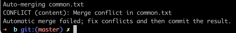 git 에서 파일을 병합하기 전에 살펴볼 때 같은 위치 상에 수정사항이 다르기 때문에 사용자에게 수정을 요구하는 메시지와 함께 각 branch에서 수정본을 합친 내용을 common파일에 저장하게 됩니다.