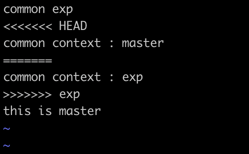 HEAD는 현재 위치한 branch이기 때문에 master이고 master에서 수정된 내용은 "common context : master"이고 같은 위치상에 exp에서 수정된 내용이 "common context : exp"라는 것을 의미합니다. 따라서 사용자는 git에서 제공한 이 메시지를 보고 소스코드를 적절하게 수정하여 다시 저장하여야 합니다.