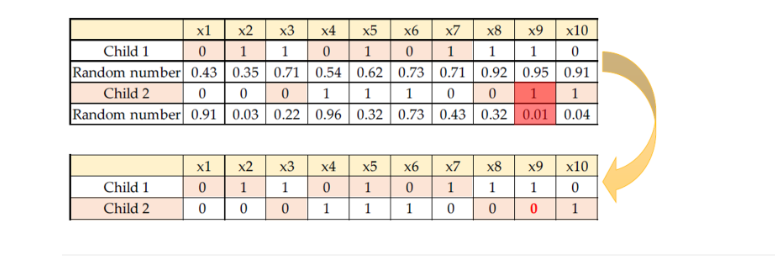 돌연변이 단계에서는 어떤 새로운 자손이 형성되면 그들의 유전자 중 일부는 낮은 확률로 돌연변이를 일으킬 수 있습니다. 이는 모집단 내의 다양성을 유지하고 조기 수렴을 방지하기 위해 발생합니다.