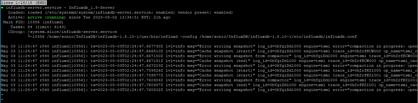 우분투 OS위에서 influxdb 서버를 systmctl에 등록한 뒤 사용하고 있는 상황인데, systemctl로 status를 찍어봤을 때, 로그에서 snapshot을 압축 할 때, info 등급의 오류가 발생했습니다.
