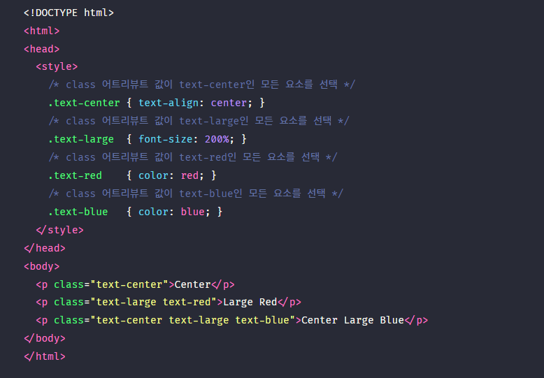 | Class 셀렉터 | .class 속성 값 | class 속성 값을 지정하여 일치하는 요소를 선택함 ( class 속성값은 중복 가능 ) |