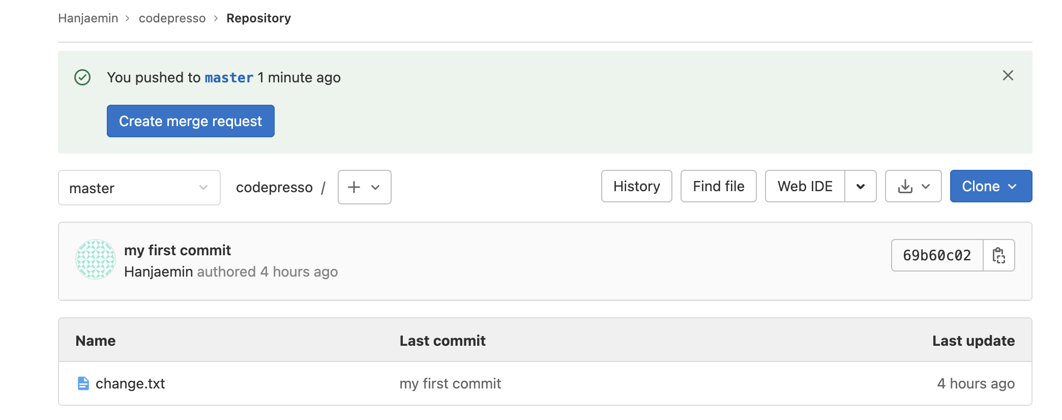 코드프레소의 강의에서는 GitHub가 아닌 GitLab을 사용하는데 GitLab 원격 저장소의 경우 Push를 하기 위해서는 계정의 이름과 비밀번호를 push마다 설정해주어야 한다.