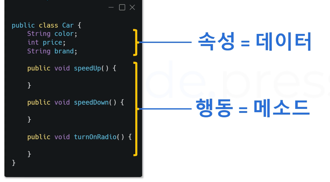 - 객체는 속성(attribute)과 행동(method)을 가진다.