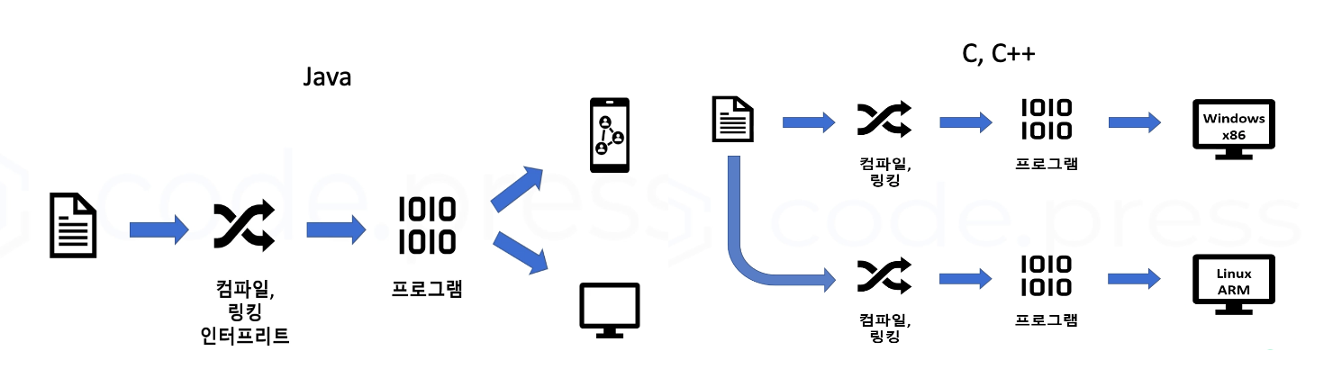- Java는 한번 작성 및 컴파일 된 결과물이 어디서든 동작 가능(anywhere)