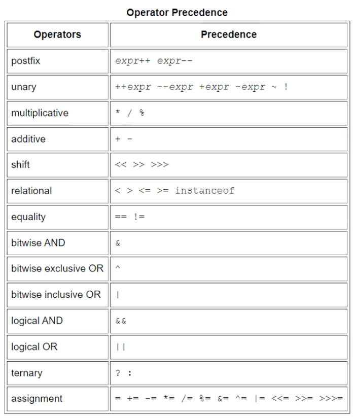 - 기본 연산자 우선순위는 위의 자료와 같다.