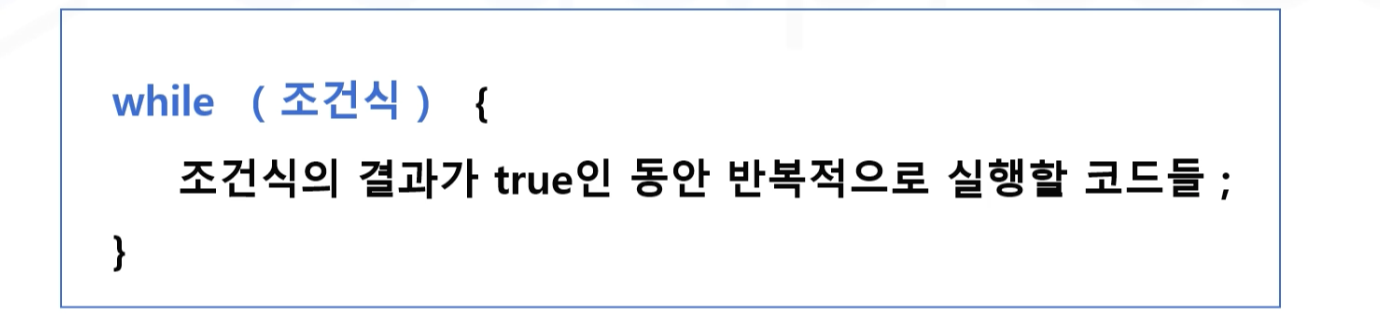 - 반복을 위한 조건식이 true 이면 코드 블럭이 실행된다.