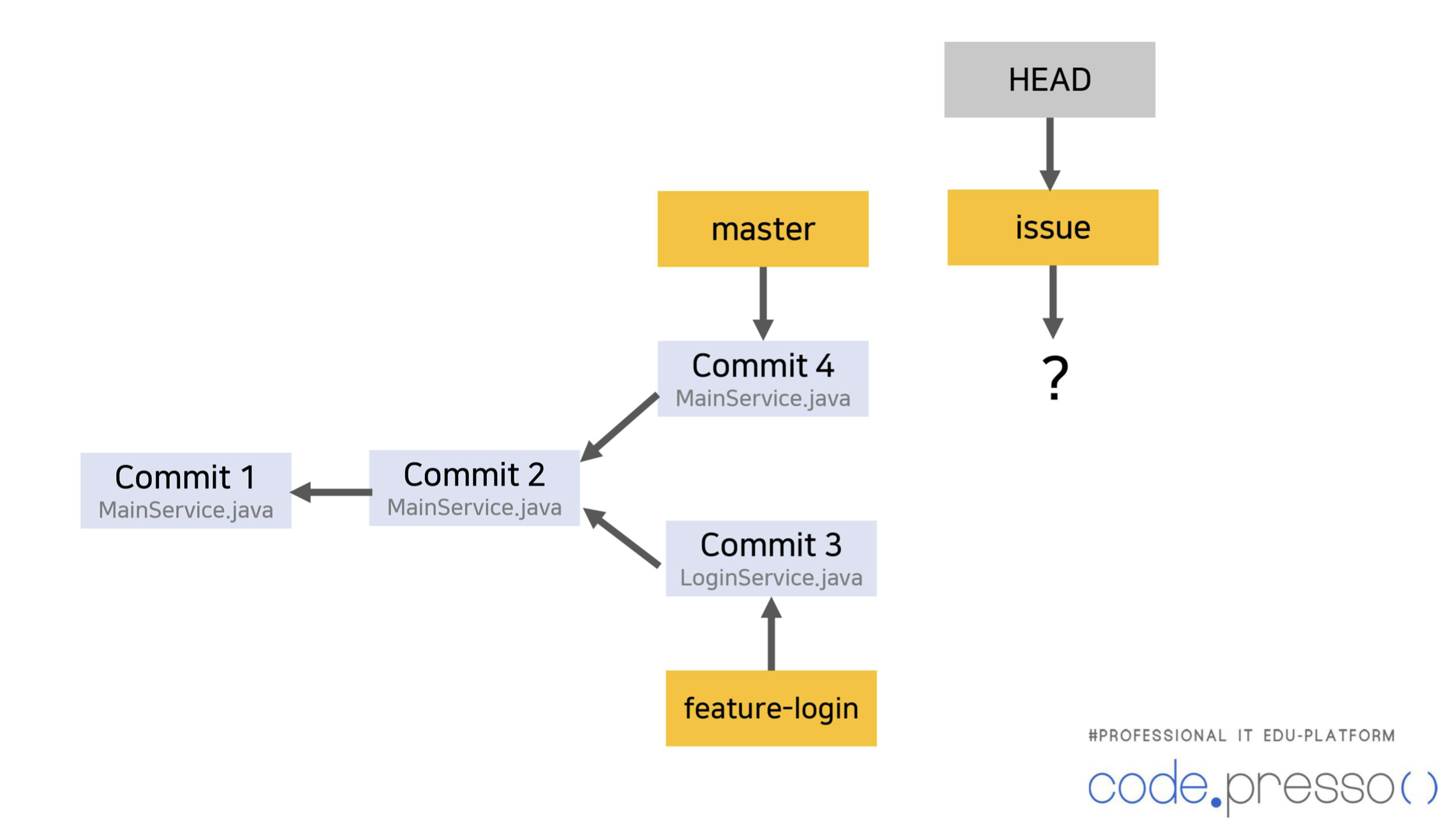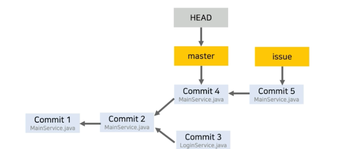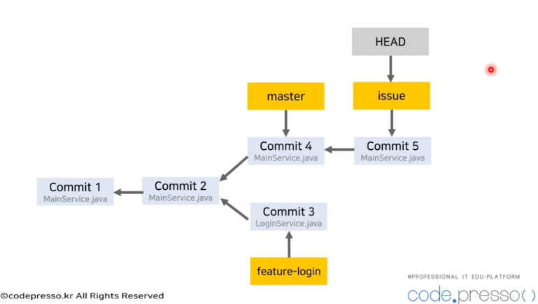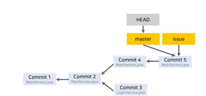 - 이 때 HEAD 포인터는 issue라는 branch의 포인터를 가지게 된다.