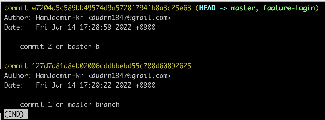 위의 코드를 분석하면 feautre-login branch는 "3번째 커밋"을 완료했고, master branch에는 방금 전과 같이 "2번째 커밋"이 되어있는 상태이다.