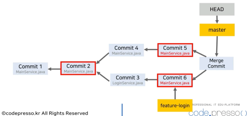 (commit3은 feature-login branch에 존재하고 여기에는 commit 4가 존재하지 않음)