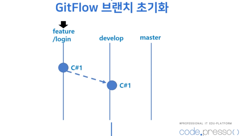 현재 상황은 git-flow 상에서 새로운 feature를 개발하기 위해 새로운 feature/login 브랜치를 만들고 커밋을 할당했다.