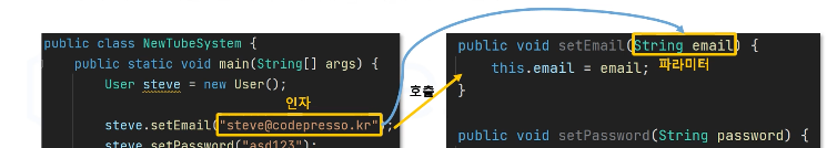 - 파라미터가 있는 생성자를 호출하기 위해서는 new 키워드로 객체 생성 시 인자를 전달해야 한다.