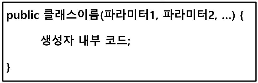 - 생성자의 이름은 클래스명과 동일하고 리턴 타입은 명시하지 않음