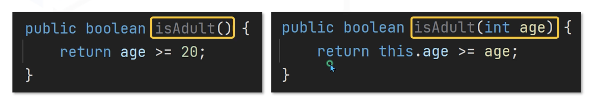 - "동일한 이름의 메소드를 한 클래스 내부에서 사용하는 것을 의미한다."