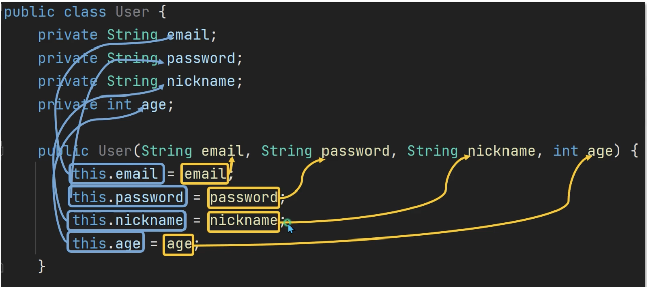 - 파라미터의 이름을 의미 있게 만들면, 멤버 변수의 이름과 보통 중복됨