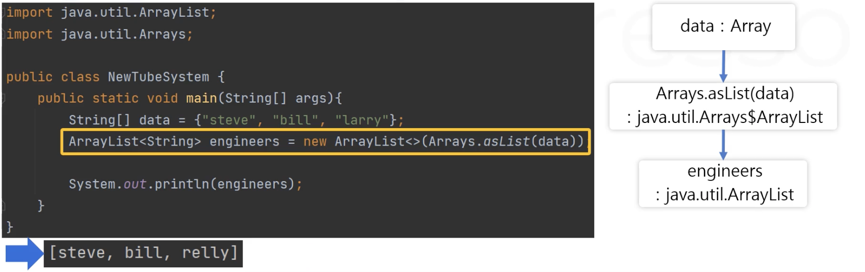 - java.util.Arrays 클래스의 static asList() 메서드를 사용하여 Array 객체를 java.util.Array$ArrayList 객체로 변환하여 ArrayList 객체 생성 시 사용 (java.util.ArrayList 클래스를 이용한 객체와는 다름)