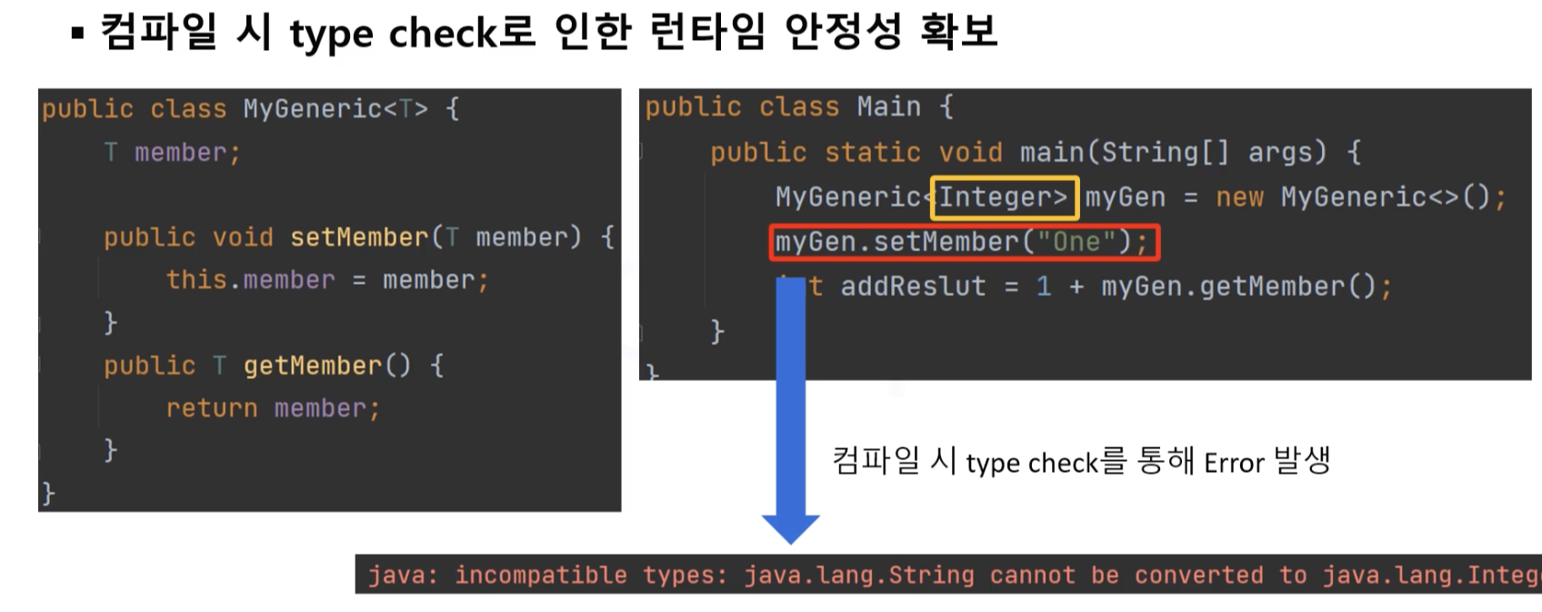 클래스와 메소드에서 사용할 데이터 타입을 컴파일 시, type check를 통해 런타임 시 안정성이 보장되낟.