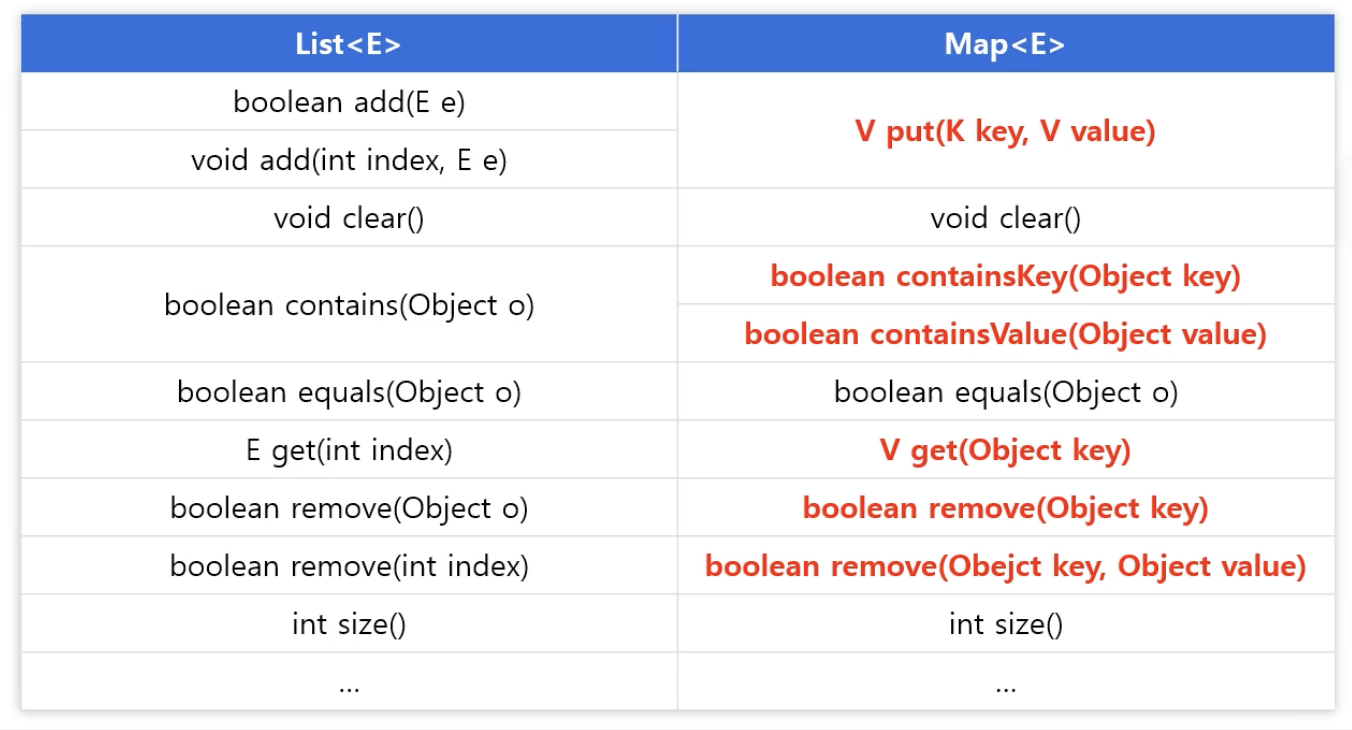 - 전체 객체를 다루는 메서드는 List<E> 인터페이스와 유사하다.