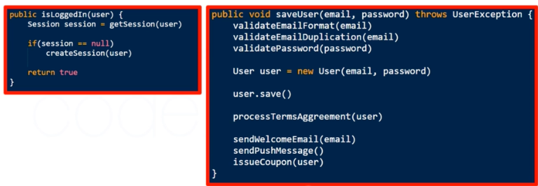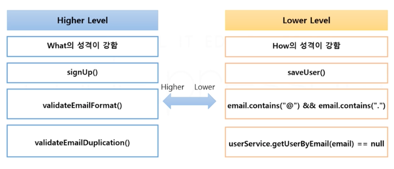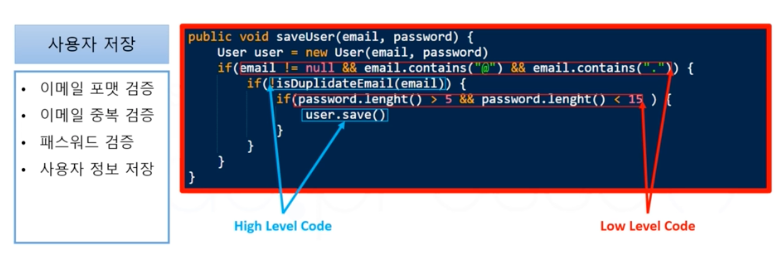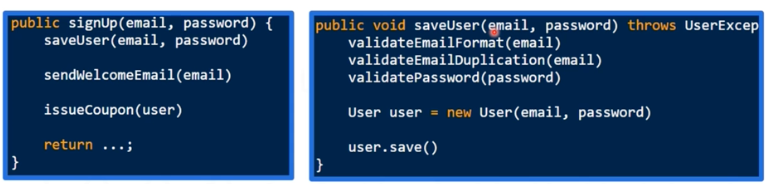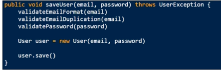 - 추상화의 레벨만 들어가서, 이메일 체크, 유저 저장, 등의 다른 추상화 레벨 역할이 없음