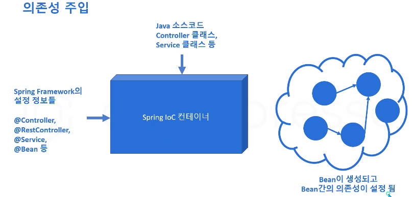- Spring Framework은 객체를 생성하고 객체 간의 의존성을 연결하는 역할을 대신 수행 해 준다.