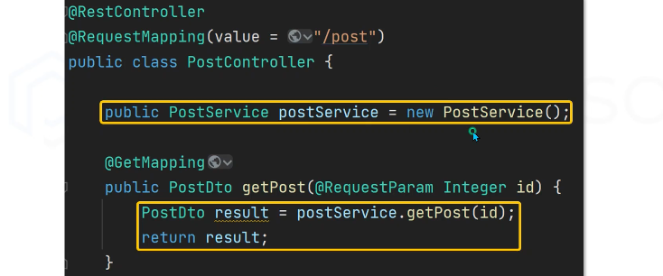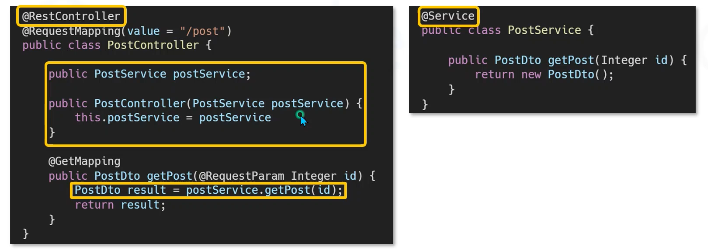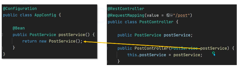 아래 그림의 PostService 객체를 new로 생성하지 않고 Spring 에서 객체를 투입한다.