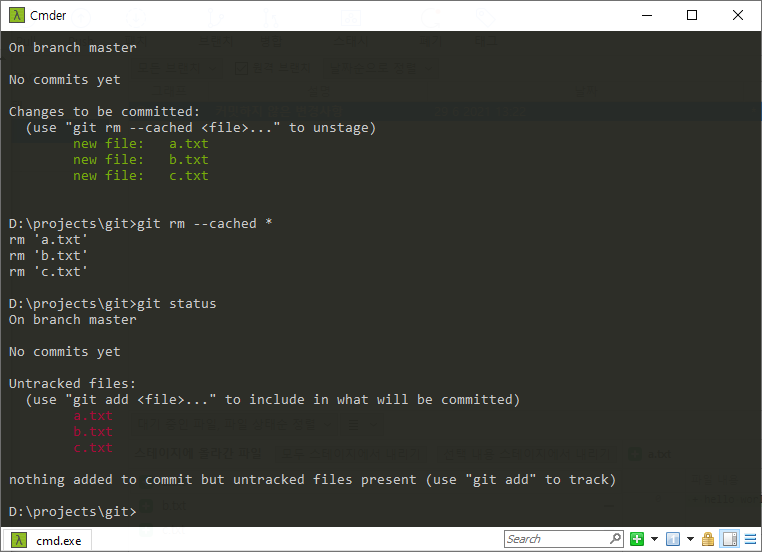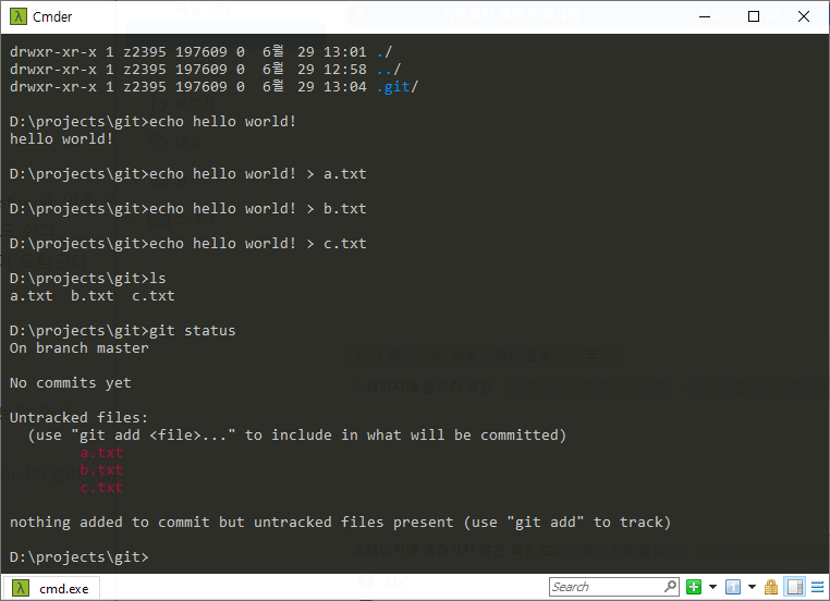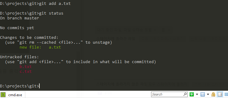 이제 a는 staging area에 이동했고 나머지 파일은 아직 working directory에서 untracked상태에 위치하고 있다.