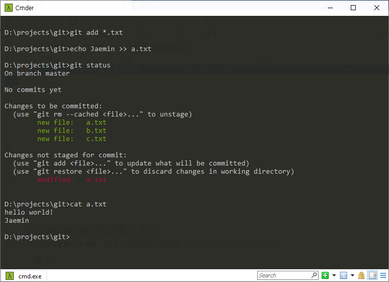 working directory의 a.txt파일은 traking이 된 modified된 형태로 "hello world! Jaemin"을 담고있다.