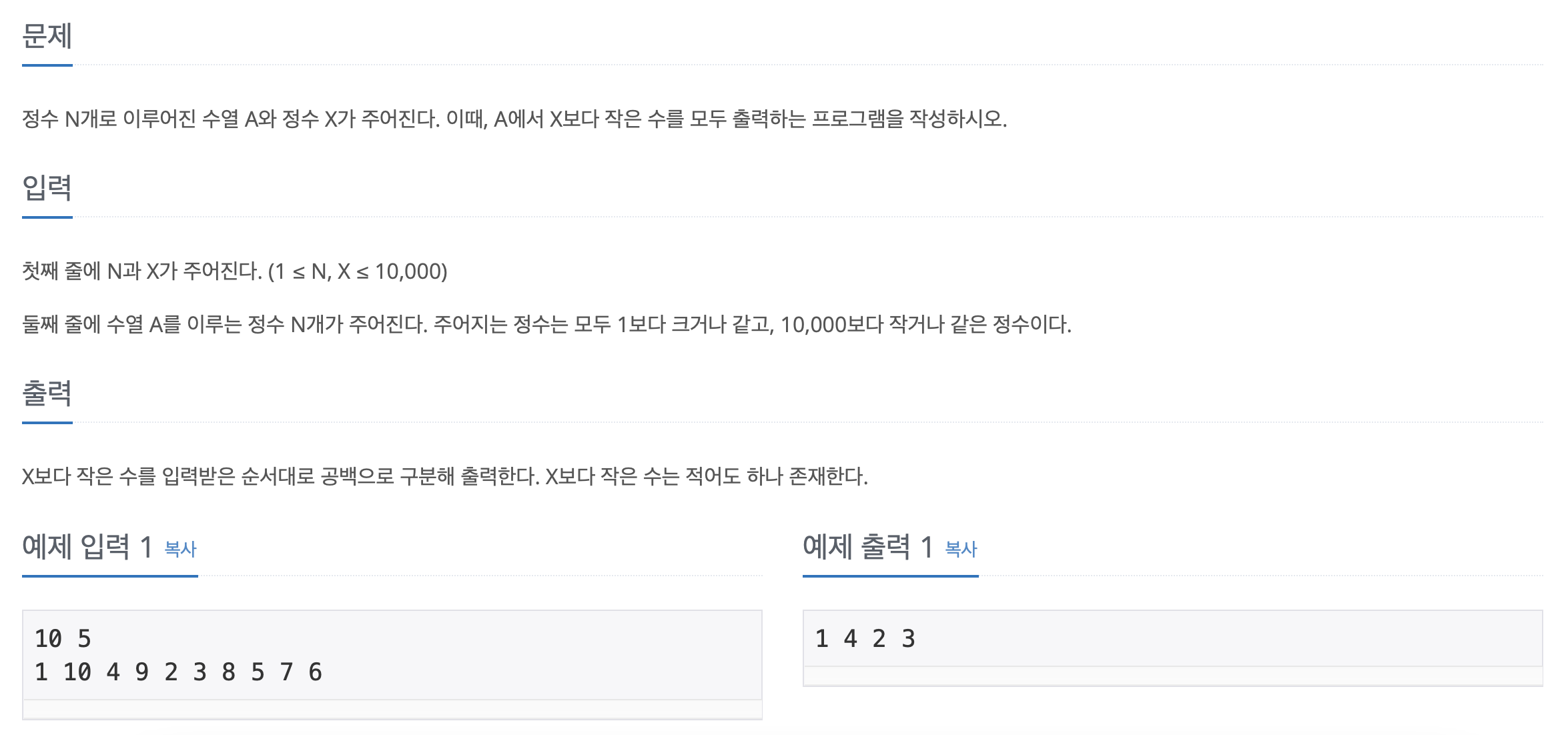 N과 비교할 숫자 X를 구분하여서 읽은 뒤