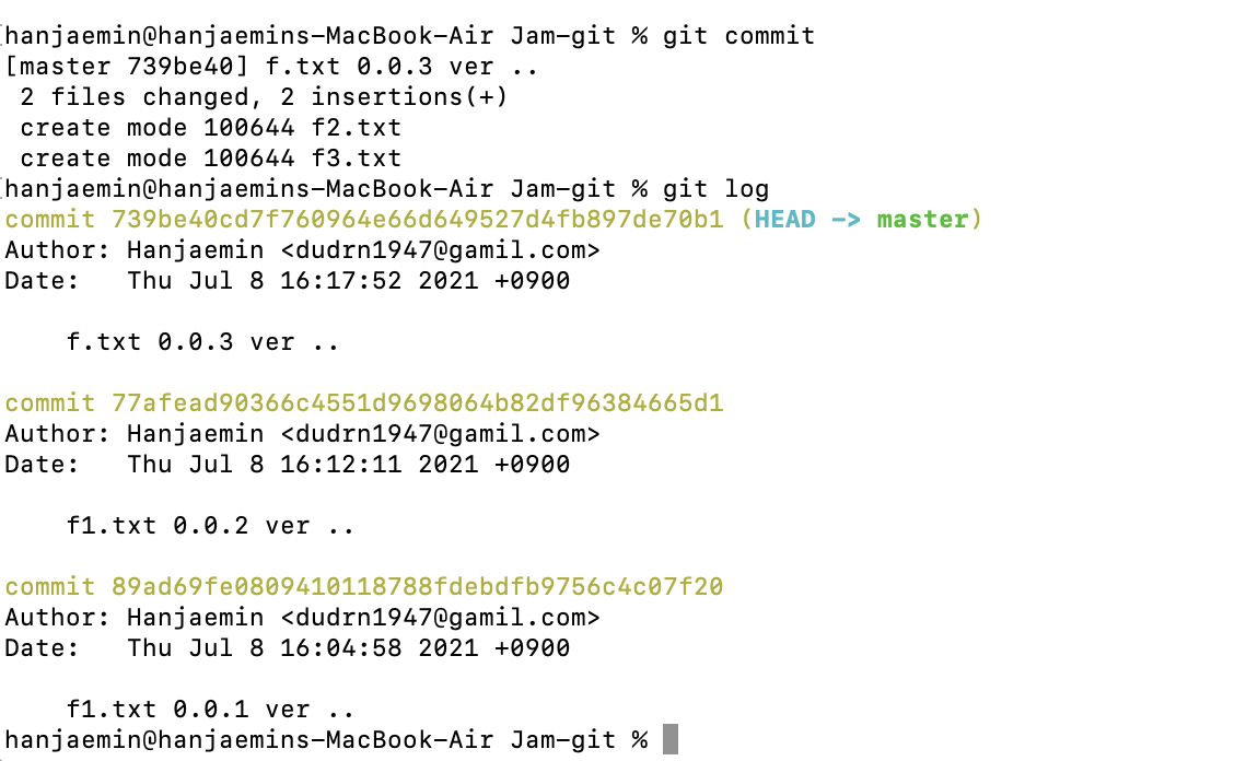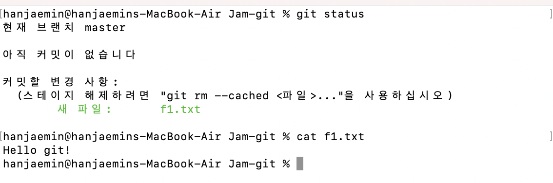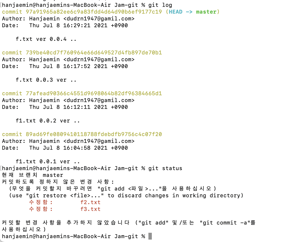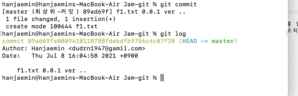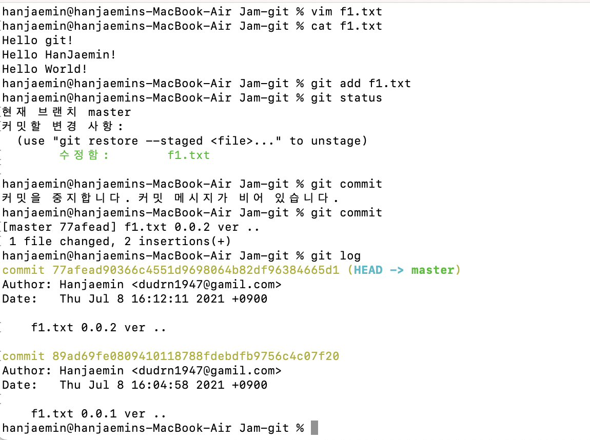 Jam-git 디렉터리에 f1.txt파일의 버전을 작성해보겠습니다.