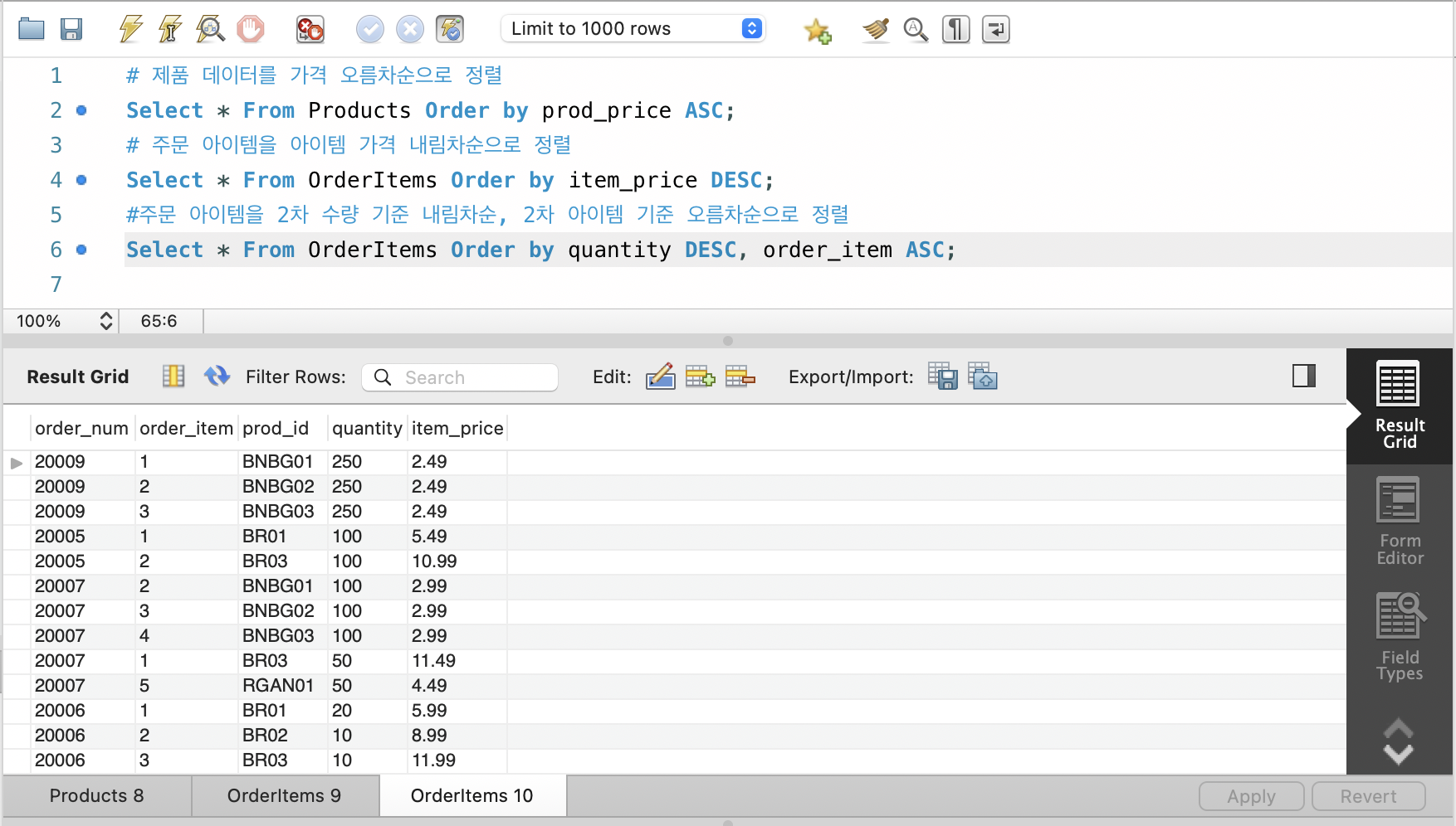 특정 컬럼을 기준으로 1개 이상의 조건으로 내림차순 또는 오름차순으로 정렬하여 조회하는 것이 가능하다.