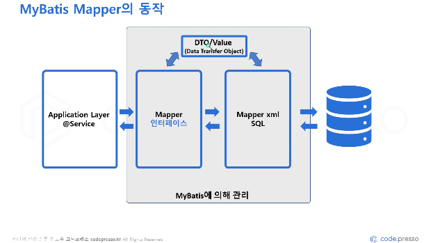| SQL Mapper | SQL과 Java 객체를 매핑하는 기술 SQL의 input 또는 output을 Java 객체와 매핑 -> java에서 SQL Mapper 적용 위해 MyBatis가 일반적으로 사용 된다. -> 국내에서 많은 기업의 대규모 프로젝트에서 활용되고 있음 |