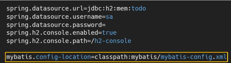 | application.properties | > sping framework가 읽고 해석하여 명시된 설정에 대한 작업 수행 > mybatis를 위한 설정 파일의 위치를 명시 |